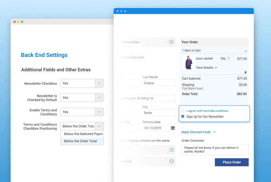 - New the ability to change the position of the Terms and Conditions checkbox was added. Now you can choose whether to display the checkbox below the 'Order Review' section or with the payment methods.