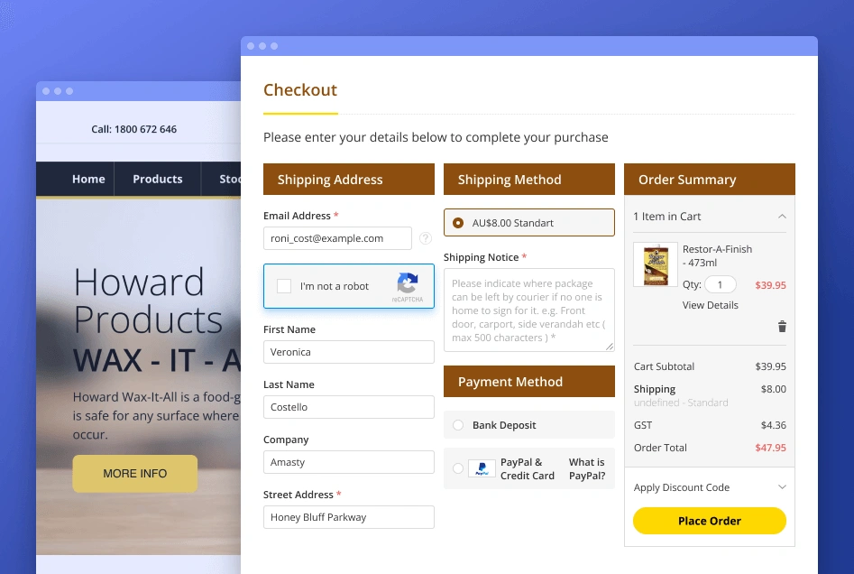 With the extension, locating the ‘Place Order’ button will be more streamlined for your customers. The 2-column layout of the Modern theme displays the ‘Order Summary’ along with the ‘Place Order’ button so it’s always visible whilst scrolling through the checkout.
